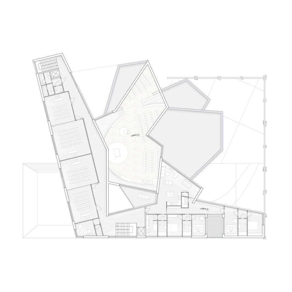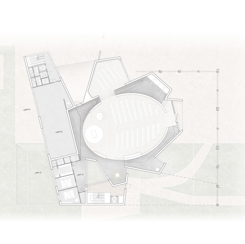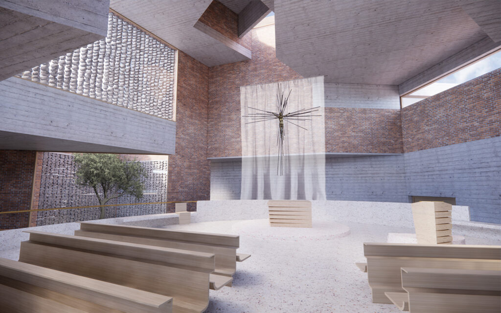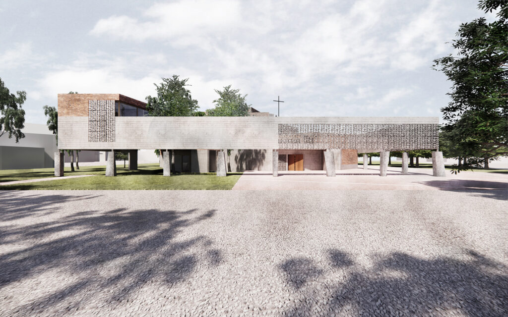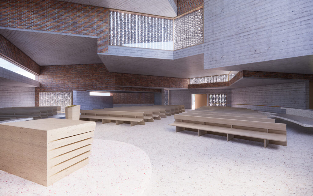 The complex also includes spaces for catechesis, the rectory, and parish activities, organized in an L-shaped plan that embraces the square and connects with the urban fabric. The use of local materials and sustainable building technologies ensures a dialogue between traditional craftsmanship and contemporary architecture.