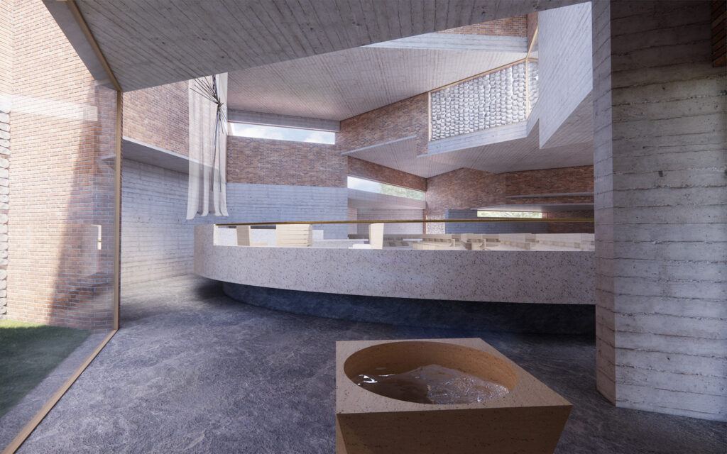The church, clearly recognizable yet never dominant, is composed of layered, tactile volumes that echo the geology and landscape of the Veneto region. Its interior, conceived as a luminous cave carved by light, offers a serene and profound spiritual experience. Stone, concrete, and natural light merge to express a balance of strength, humanity, and transcendence.